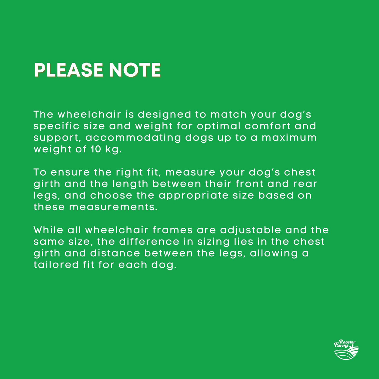 Sizing Note: This wheelchair is specifically designed for small dog breeds up to 10kg. The wheelchair frame remains the same size across all options — what changes is the harness size, which must match your dog’s body measurements.